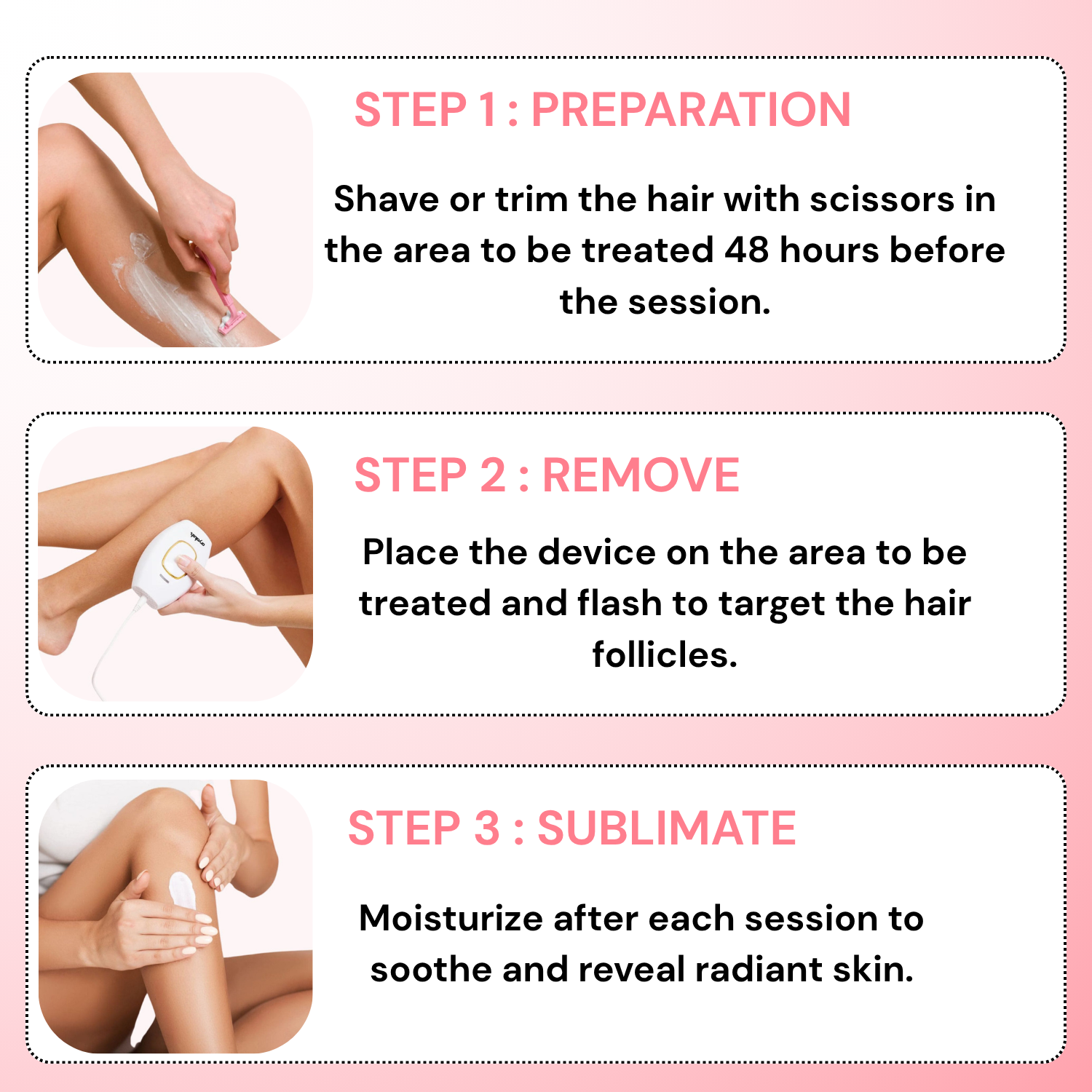 Shave the area to be treated 48 hours before each session. This allows the hair follicle to absorb the light effectively. If necessary, you can also trim the hair with scissors just before the session.
